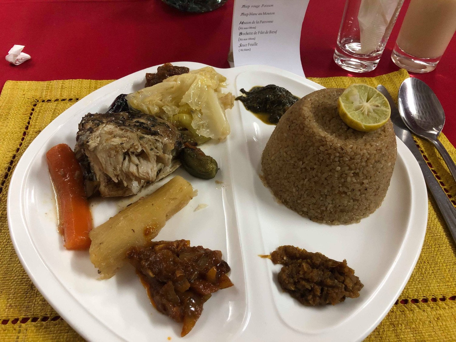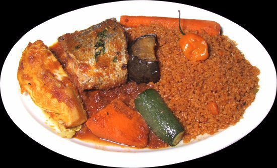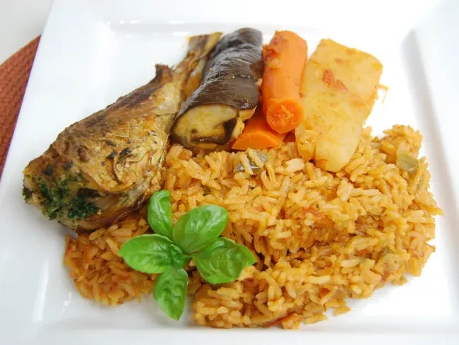 Tchep Tieboudiene au Poisson Riz Gras Salade Tomate Oignon Crudité Pimenté