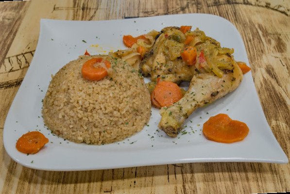 Tchep au Poulet Riz Gras Salade Tomate Oignon Crudité Pimenté