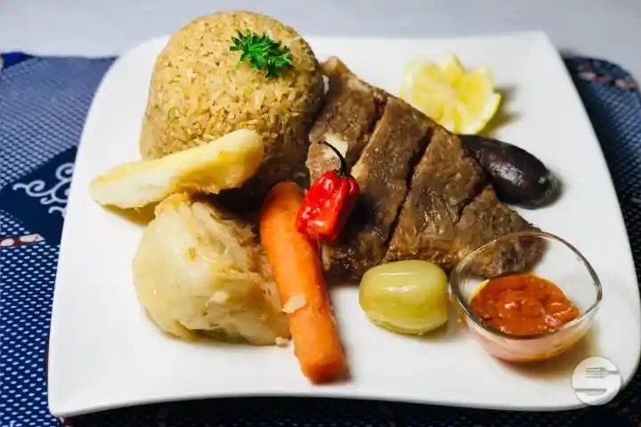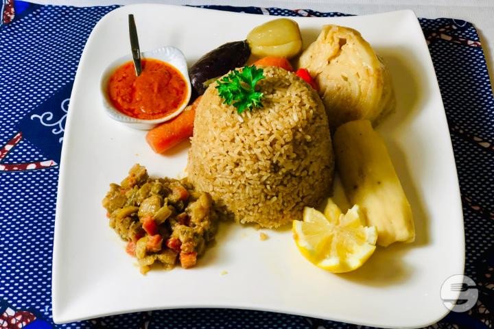 Tchep Tieboudiene au Poisson Riz Gras Salade Tomate Oignon Crudité Pimenté